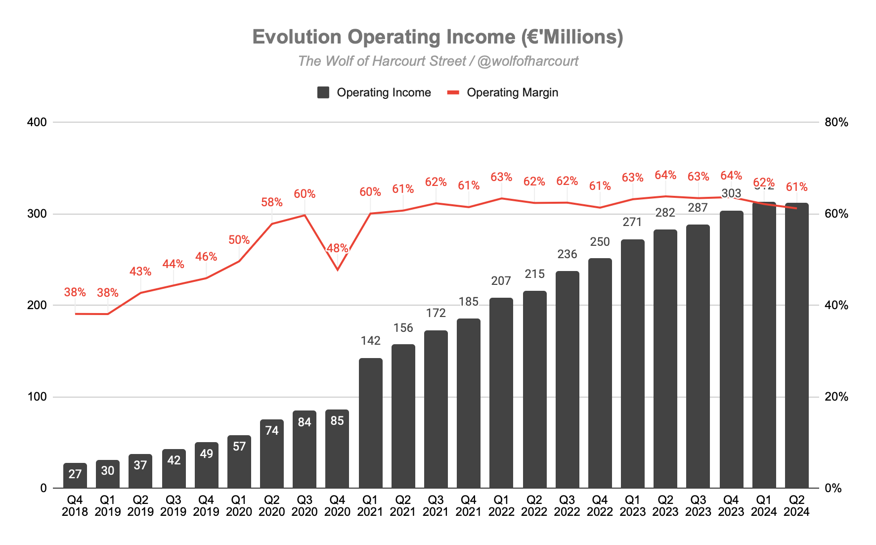 Evolution’s operating margin dipped to 61% as total operating expenses increased by 24% YoY to €193 million.