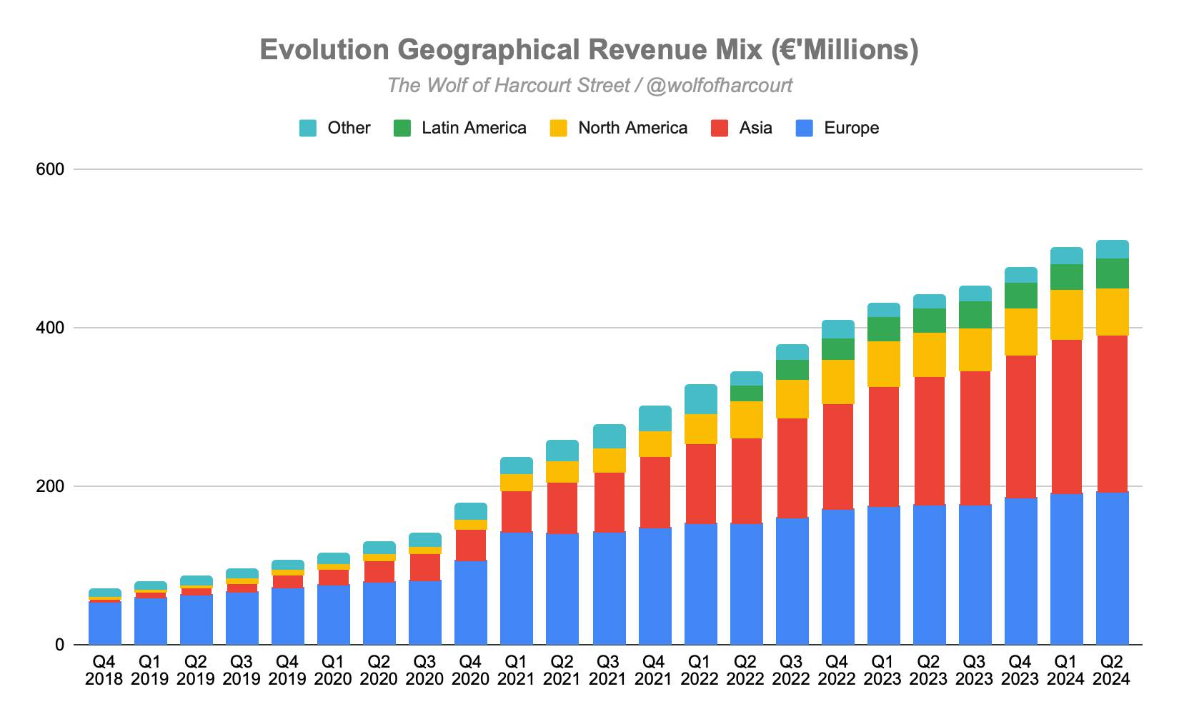 After surpassing Europe in Q1 2024, Asia is now the largest geographical source of revenue for Evolution, accounting for 39% of the total and growing at 22% during the quarter. Management views Asia as a region of high potential due to its large population and favorable online market statistics. Europe, which now accounts for 38%, grew 9%. North America, which grew 8%, accounts for 12%, but management noted that they are losing market share in RNG in the region compared to last year. Latin America, which accounts for 7%, also posted solid double-digit growth of 17% despite pending regulatory changes in Brazil.