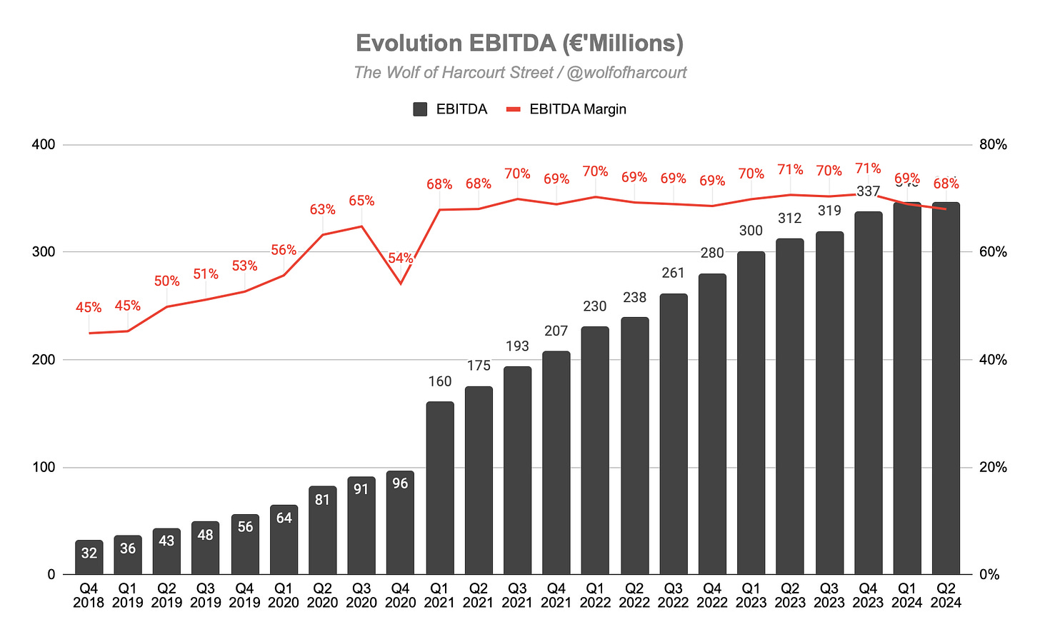 As a result of the faster expansion during the first six months of the year, the EBITDA margin came in lower at 68%. Management has maintained the full-year 2024 guidance of a 69%-71% EBITDA margin.