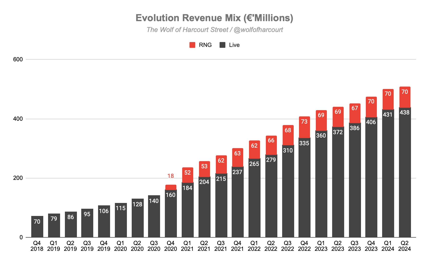 Evolution’s business is a tale of two stories. Live, which accounts for 86% of total revenue, grew 18% YoY. This growth was driven primarily by increased commission income from existing customers. On the other hand, RNG, which accounts for the remaining 14%, grew only 1% YoY and remained flat quarter-over-quarter (QoQ).