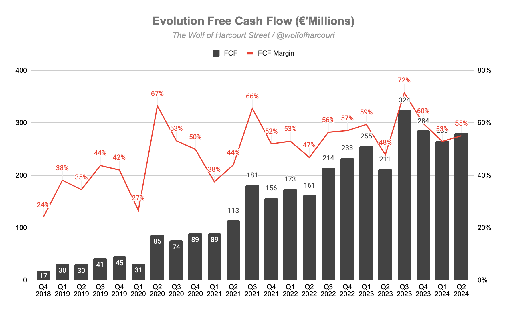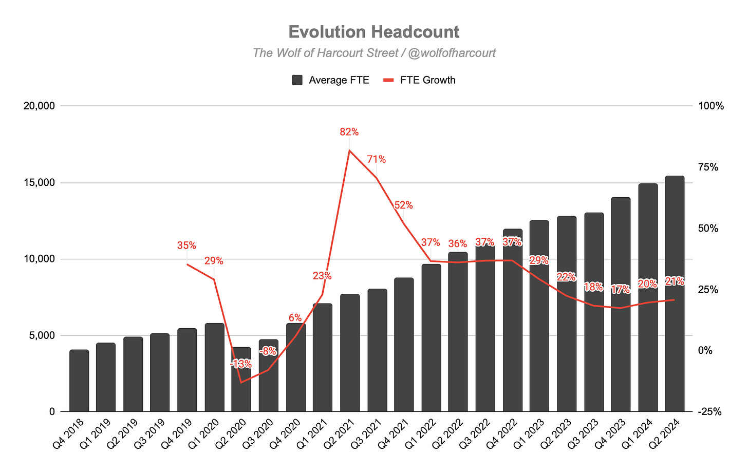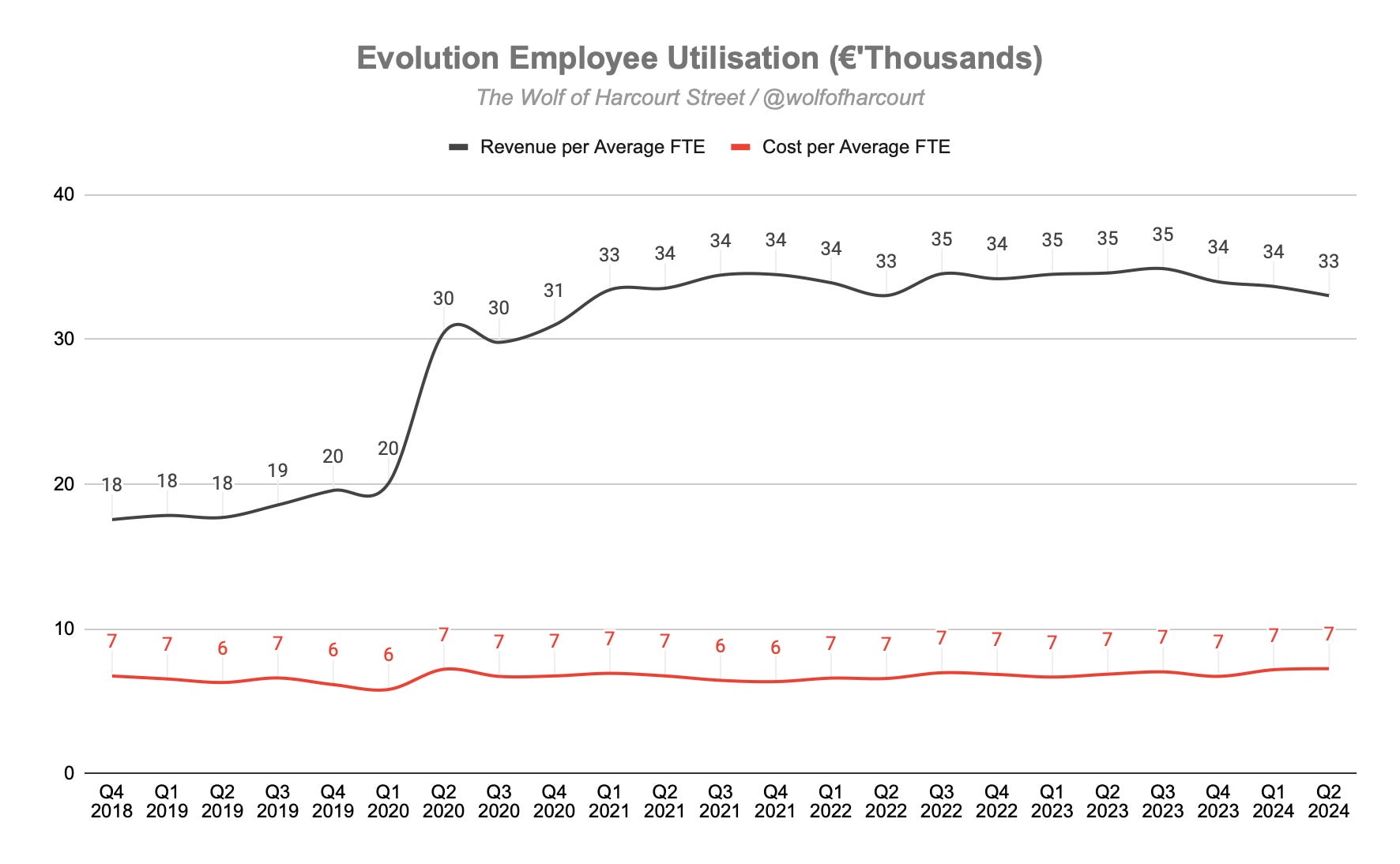 While the cost per average FTE has remained consistent at around €7k per quarter, the revenue per average FTE has decreased from €35k in 2023 to €33k in Q2 2024. During a period of accelerated hiring, it is expected that the revenue per average FTE would fall as new hires require training to gradually get up to speed. Evolution's revenue per average FTE is currently 4.6 times greater than its cost per average FTE.