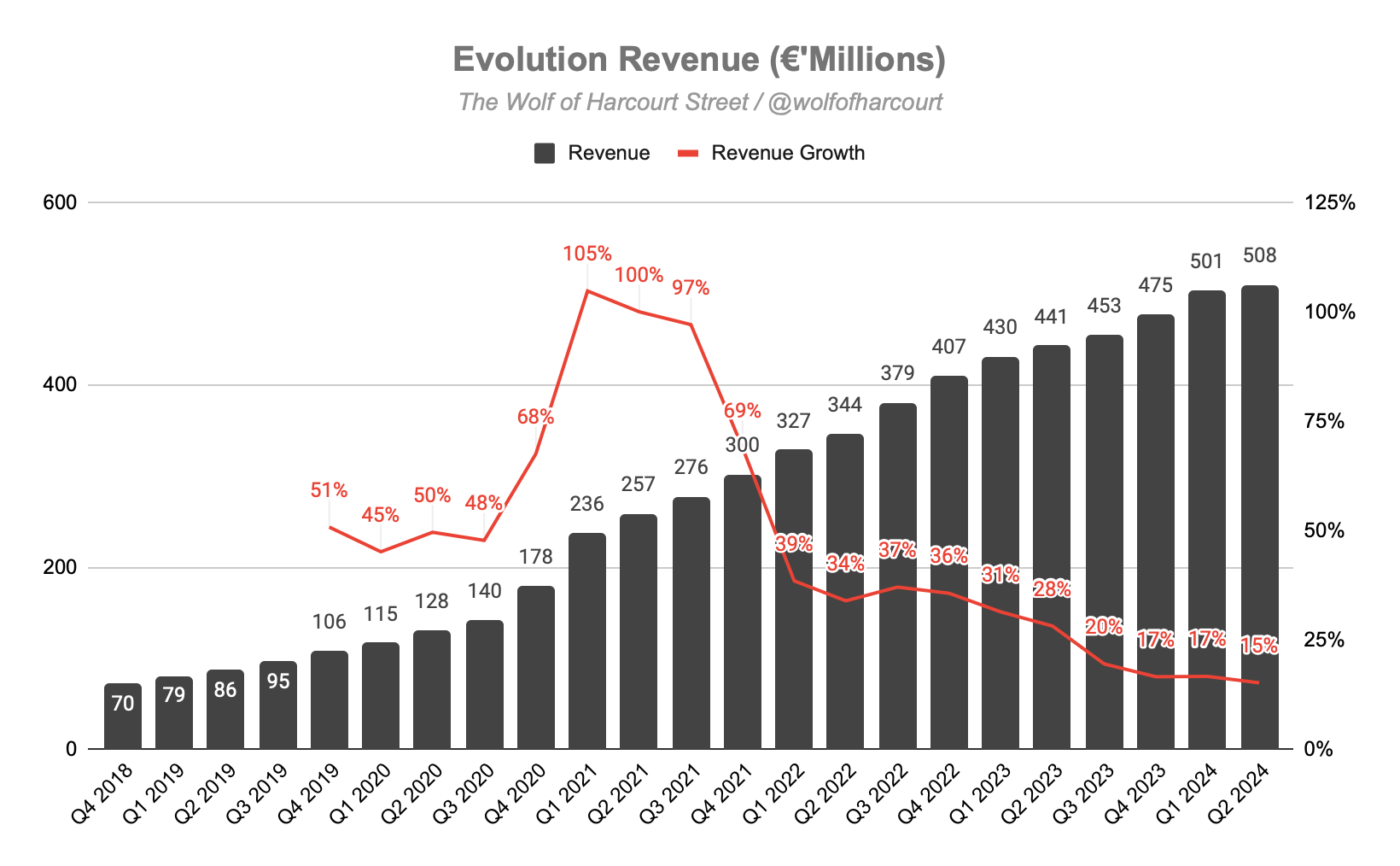 Evolution's revenue growth continues to trend downwards despite still growing double digits. Foreign exchange has been a material headwind for revenue growth over the past few quarters. In Q2, underlying revenue growth was 19%, compared to 15% in reported currency. Another reason for the slower revenue growth was the record payout of €35 million to more than 5,000 Crazy Time players in a single game. Although this had a short-term impact on revenue share, it ultimately increases player engagement. Larger wins can attract many players who often place smaller bets, which doesn't immediately boost revenue.