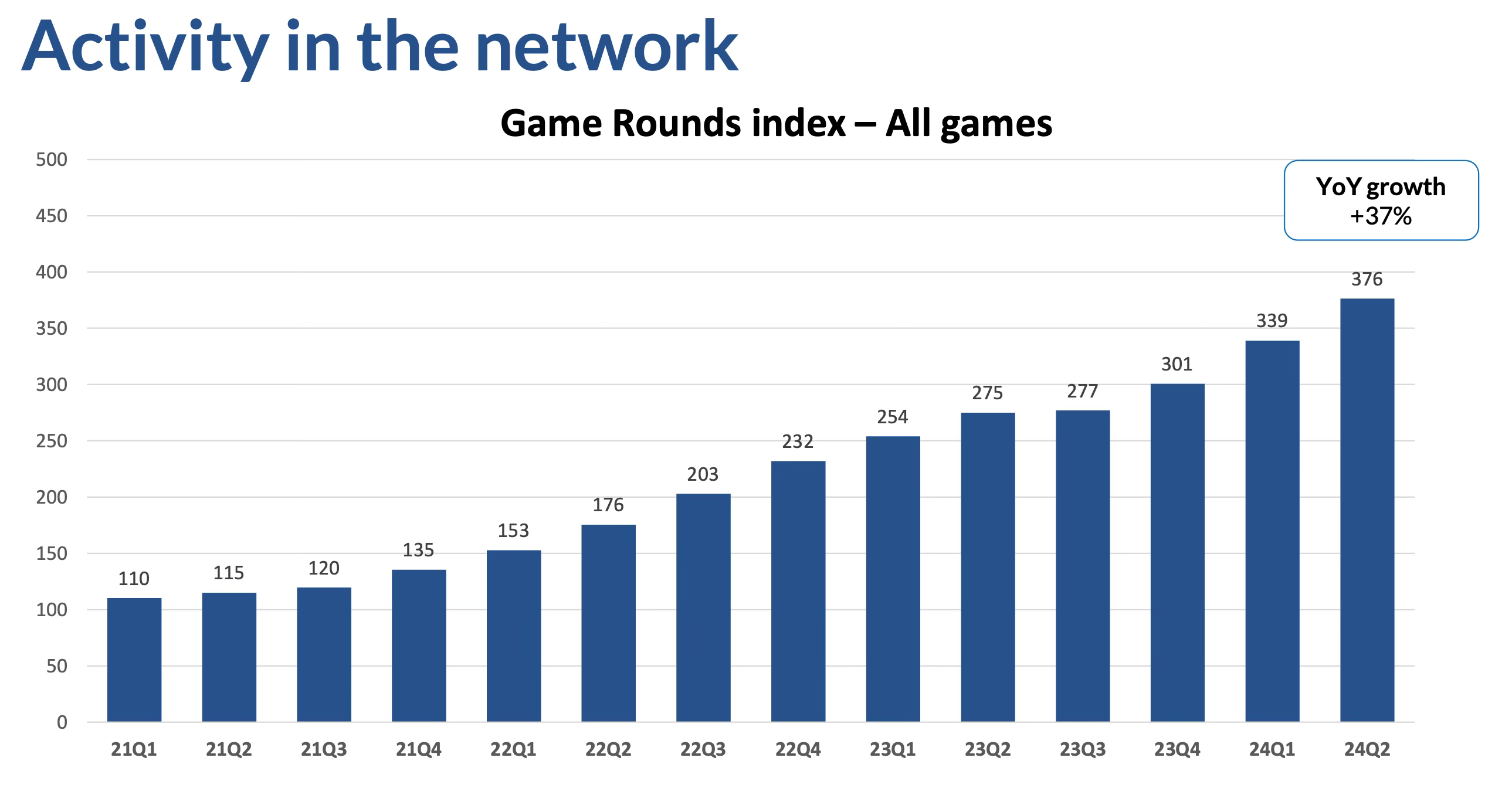 This index reflects the overall activity and development within the Evolution network, covering all games. There was a rise in activity during the quarter, continuing the positive trend from the first quarter. This increase was supported by efforts to expand table capacity and ensure high-quality delivery from studios.