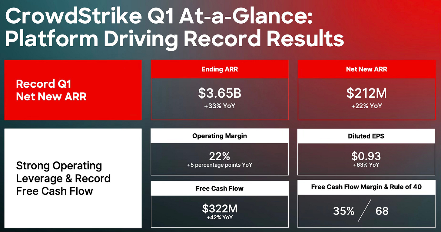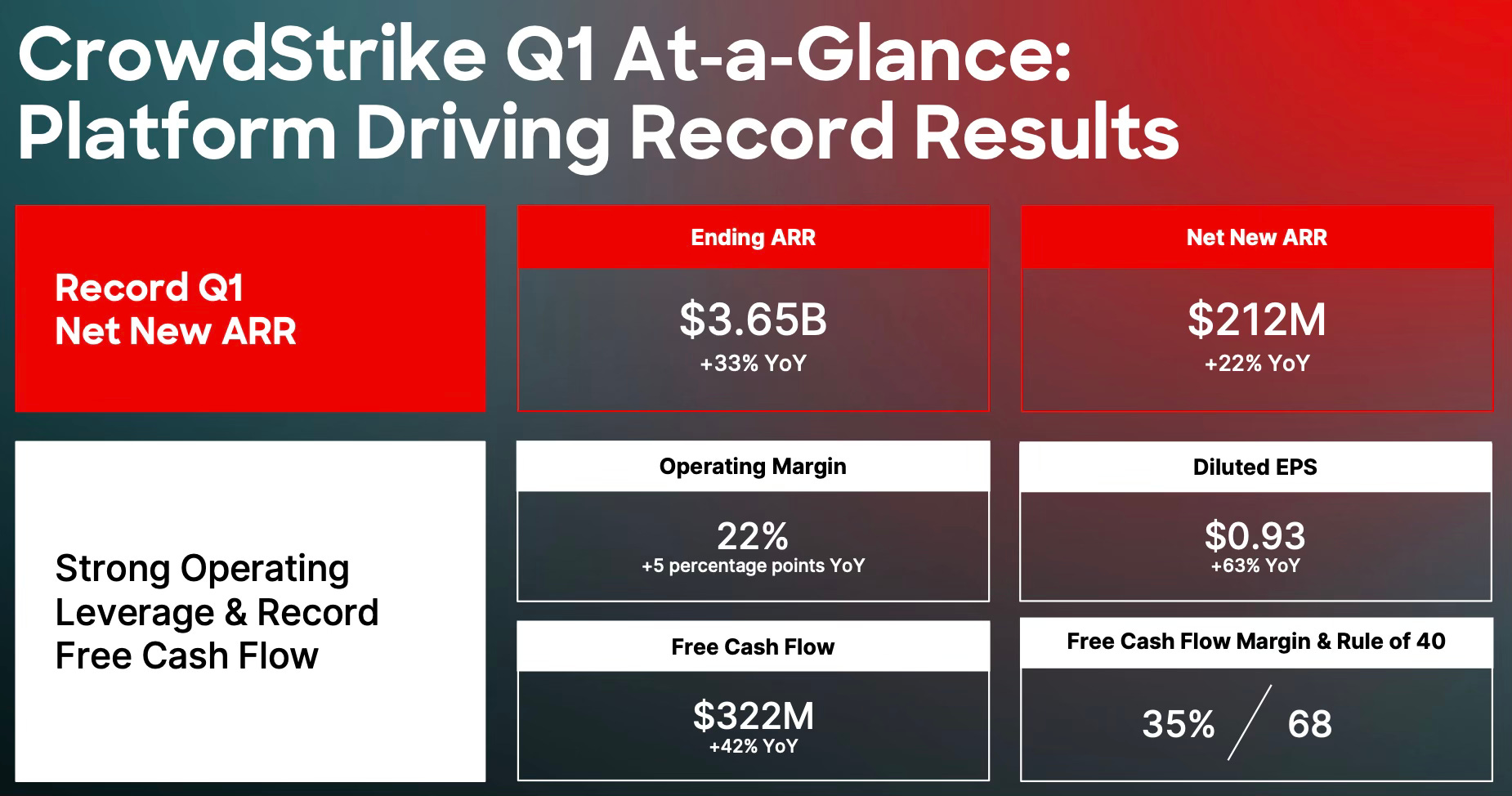 CRWD delivered exceptional Q1 results, setting records across multiple metrics. Key highlights include: