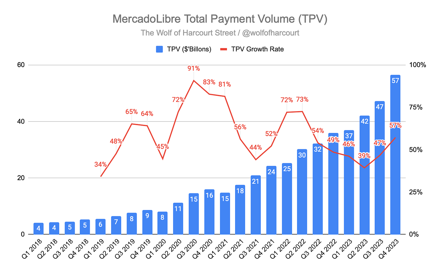 MELI’s continued momentum and top-line growth is beginning to defy the law of large numbers. Despite its size, MELI managed to add an extra $9 billion of TPV in one quarter alone. For context in Q1 2020, MELI’s reported TPV was $8.1 billion. Similarly with GMV, MELI added an incremental $2 billion in one quarter, more than it added from Q1 2023 to Q3 2023 combined.