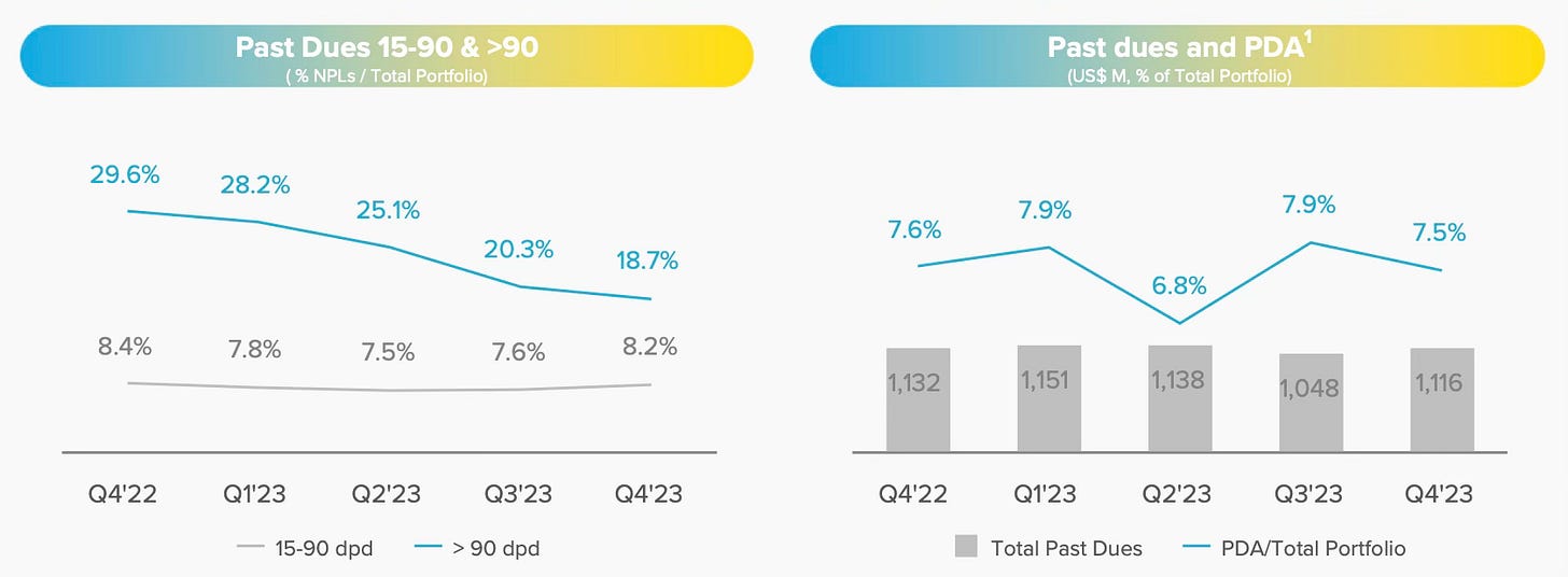 In Q4 2023, the provision was equivalent to 7.5% of the portfolio, reflecting Mercado Crédito's conservative provisioning policy. The decrease in total past dues in dollar terms was attributed to the continued prioritization of asset quality and organic write-off of previous cohorts. This policy ensures high levels of coverage throughout the life of the loan.