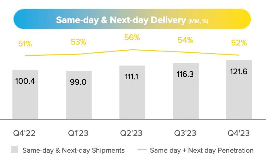 MELI shipped a total of 407 million items in Q4 2023, indicating a strong growth rate of 31% YoY. This growth is the highest since Q3 2021, underscoring the platform's increasing scale and efficiency in handling a larger volume of shipments.
