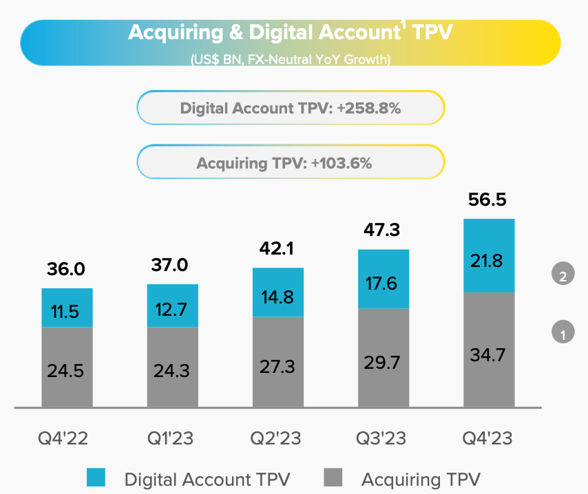 Mercado Pago's Total Payment Volume (TPV) reached $56.5 billion, with Acquiring TPV of $34.7 billion growing at an impressive 104% year-over-year (YoY) on an FX-neutral basis. This reflects the platform's robust performance in facilitating transactions.