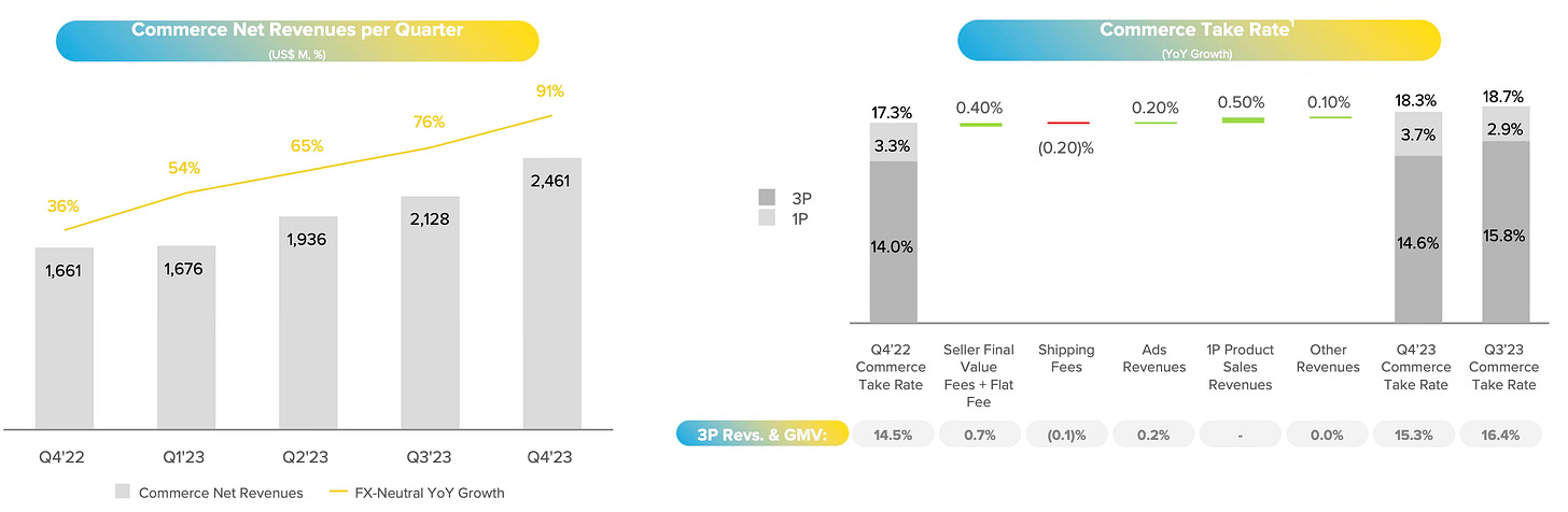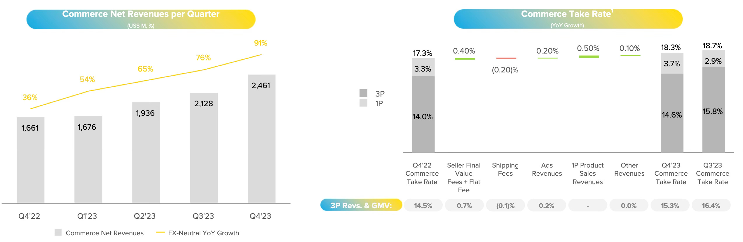Commerce revenue growth accelerated 91% YoY on an FX-neutral basis to $2.46 billion, driven by a step up in first-party product sales and continued monetisation efforts that drove the take rate higher.