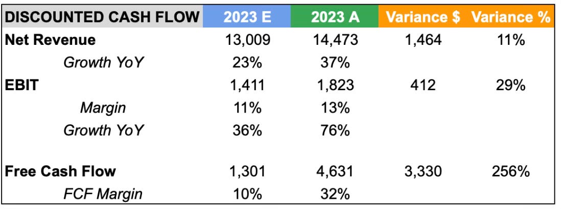 When I shared my initial MercadoLibre Investment Thesis last year, the stock traded at $1,192. At the time of writing, the stock is trading at $1,665 after hours, meaning that the investment has returned 40% in less than 12 months. In light of this, let's revisit the assumptions I made and compare them to the actual results. MELI smashed my expectations for revenue, EBIT and FCF by 11%, 29% and 256% respectively.