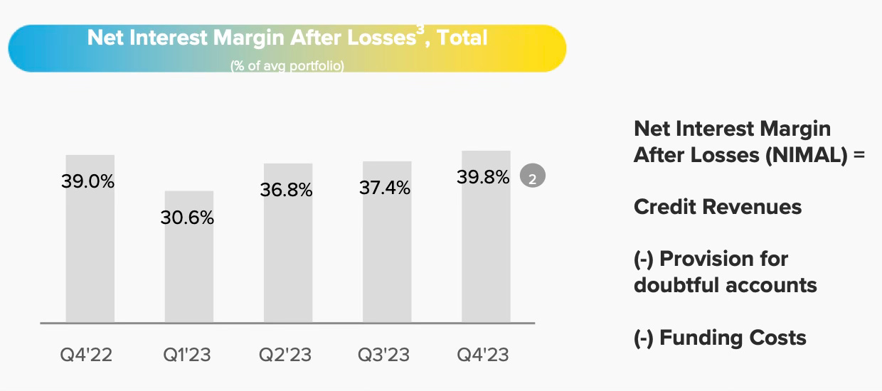 Mercado Crédito's credit portfolio reached nearly $3.8 billion in Q4 2023, reflecting a significant YoY growth of 33%. The main drivers of this growth were the Credit Card and Consumer books. The annualized NIMAL (Net Interest Margin after Loan Loss Provisions) spread increased both YoY and QoQ to 39.8%. This growth underscores Mercado Crédito's ability to accurately price risk and its cautious risk management approach.