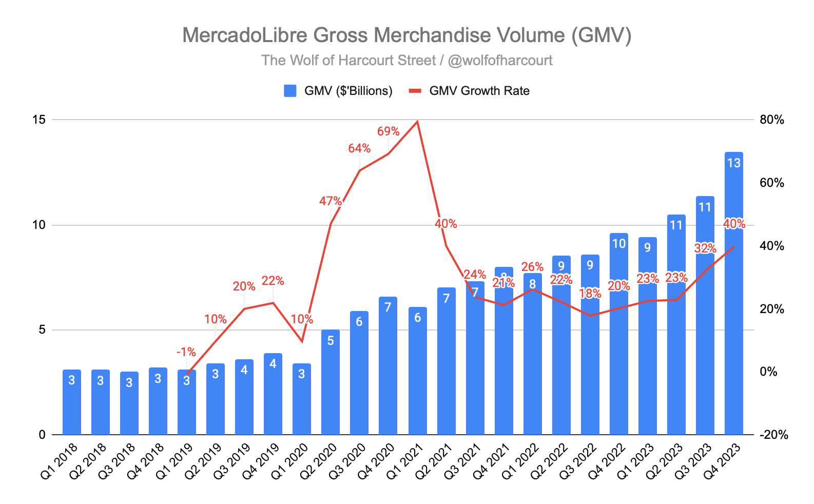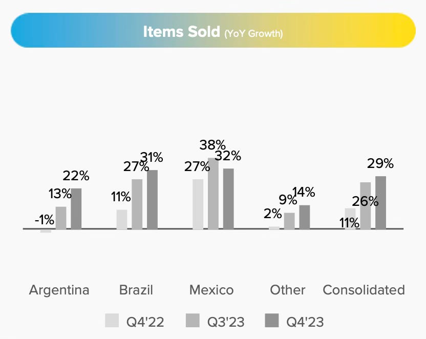 MELI's sales of items continued to accelerate for the fifth consecutive quarter, growing by 29% YoY in Q4. MELI sold an additional 92 million items YoY in Q4, compared to the additional 73 million items sold in Q3 and 50 million in Q2. This growth trend is noteworthy and is the fastest achieved since Q2 2021. Both Brazil and Mexico delivered growth of more than 30% YoY in items sold, while Argentina showed acceleration.