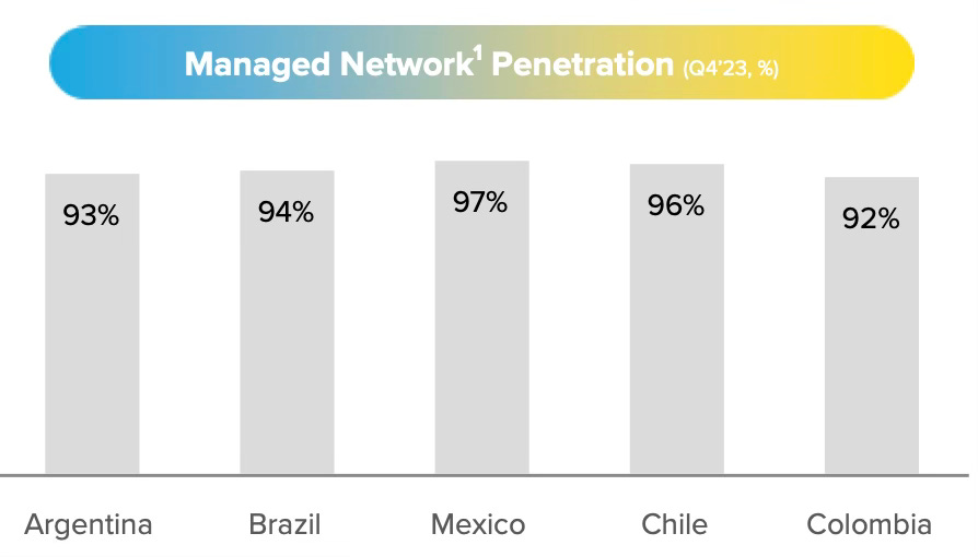 The total penetration of the Managed Network reached a record level of 94.4%, showcasing ongoing improvements in most geographic segments. Fulfillment by MELI also reached a record level, constituting almost 50% of shipments. Brazil made significant progress, with a 10-percentage-point increase in penetration YoY.