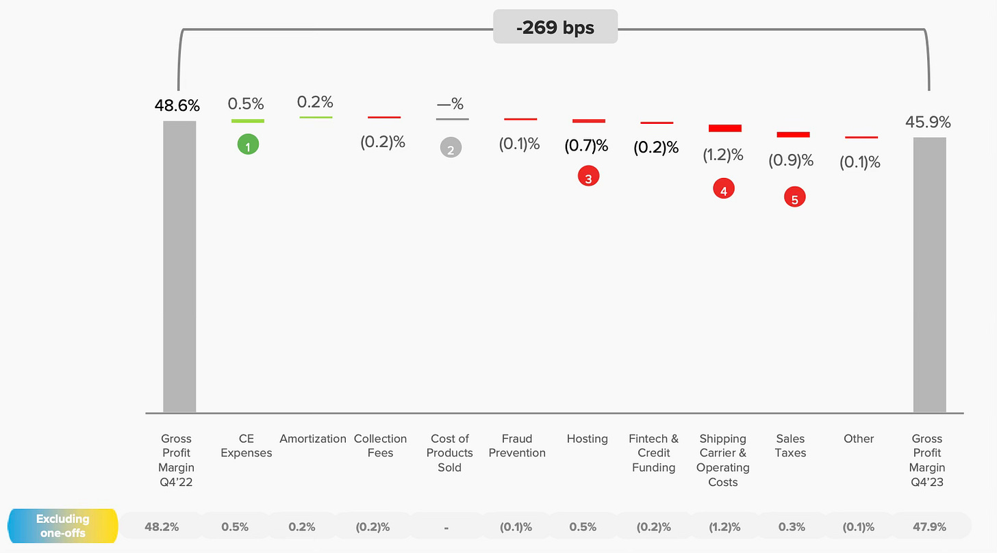 MELI faced significant one-off expenses in Q4, totaling $350 million. These expenses were associated with contingent tax liabilities related to prior periods, ongoing legal proceedings, and a DIFAL sales tax ruling in Brazil. These expenses caused the gross margin and operating margin to contract by 269 basis points and 600 basis points, respectively. Despite this, when excluding these expenses, the company showed improvement in its operating margin, emphasizing the positive effects of business growth and cost management.