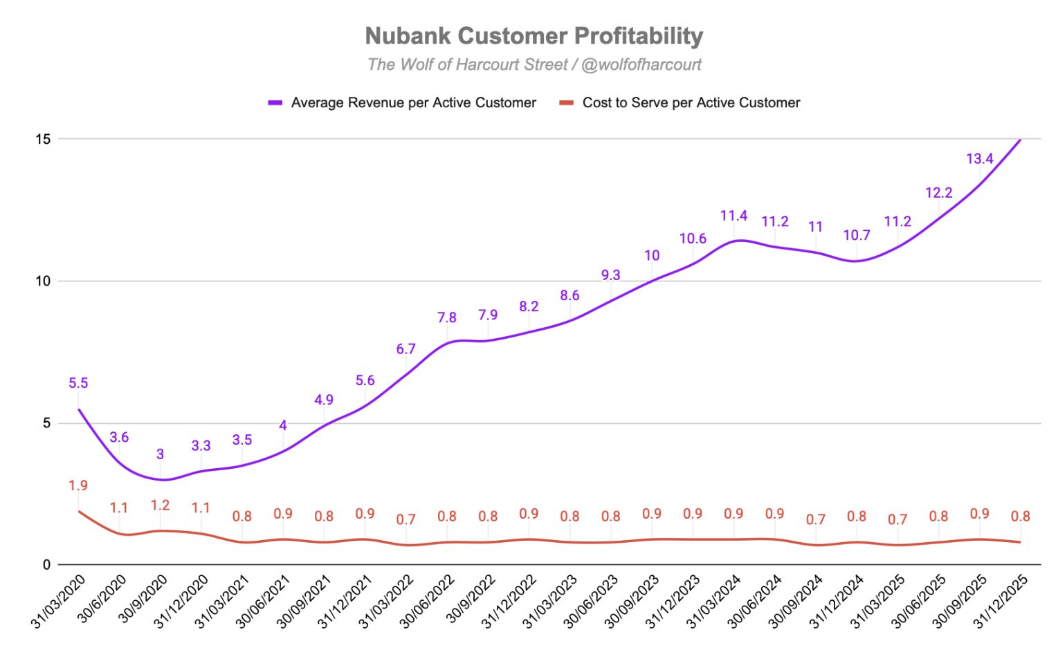 Importantly, nearly half of NU’s customer base joined within the past three years. Even so, average revenue per active customer, ARPAC, reached a record $15. That is already 19 times its cost to serve, before considering increased wallet share and monetisation as cohorts mature.