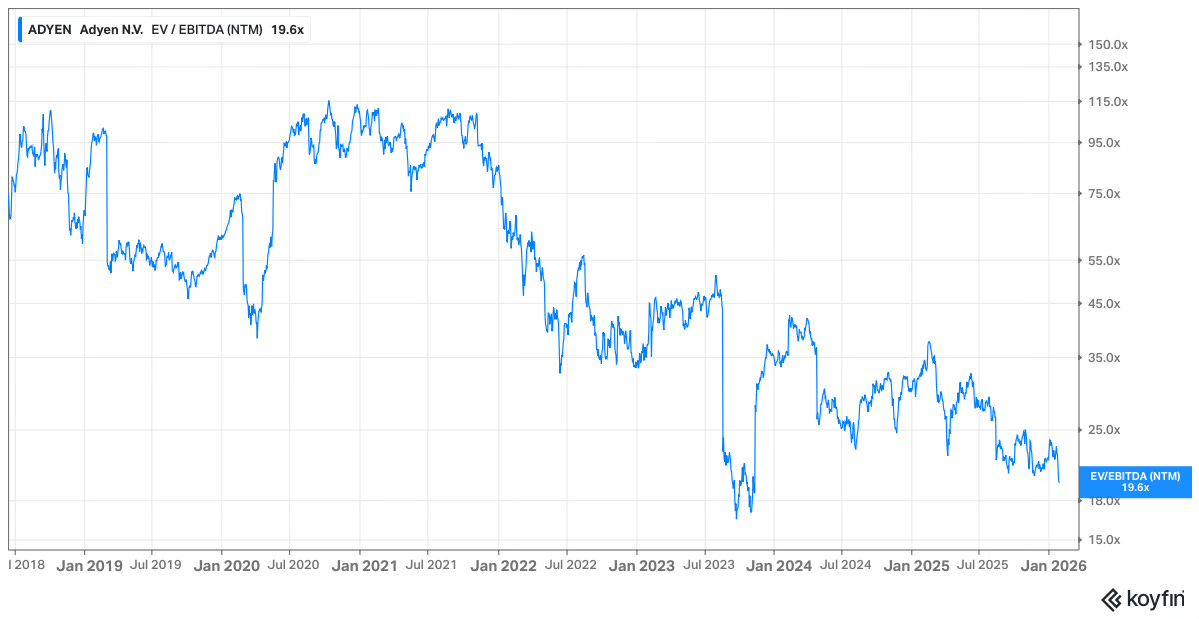 I built the majority of my position in 2023 when the stock was cut in half and traded below €700. At that point, the forward EV/EBITDA multiple fell to ~16x. Enterprise Value is the appropriate metric for Adyen given the large amount of cash it holds on behalf of merchants.