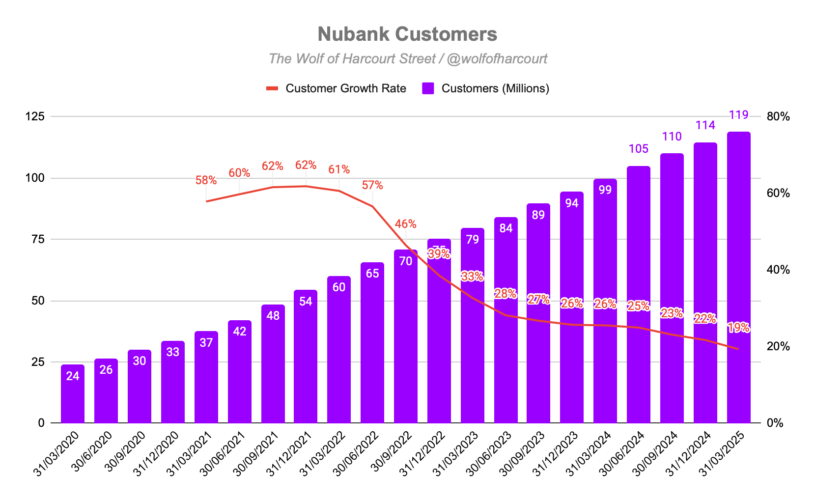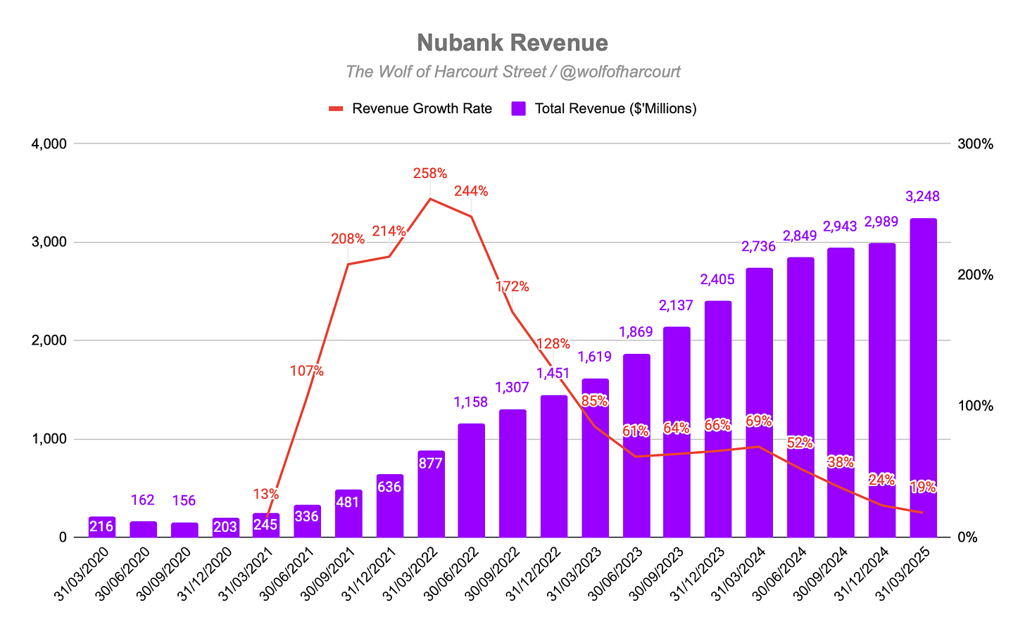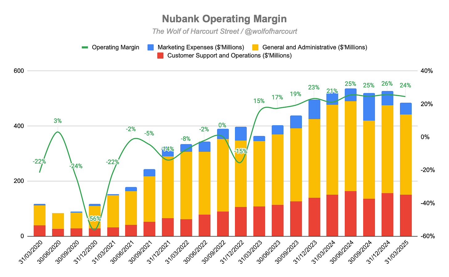 Operating Margin: NU achieved an operating margin of 24%, up from 21% YoY but down from 26% QoQ. Margin pressure from higher interest rates and international expansion is considered strategic and temporary.