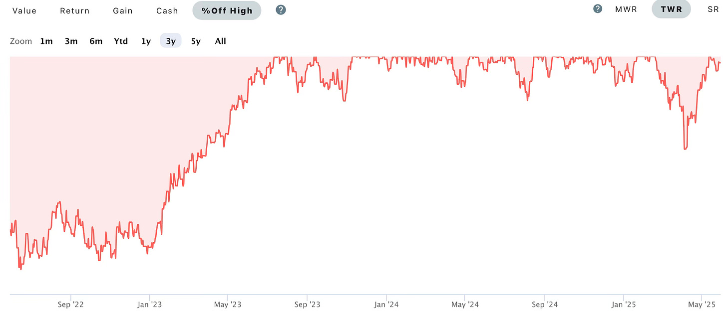 After a 19% drawdown in April, the portfolio rebounded strongly in May to reach a new all-time high.