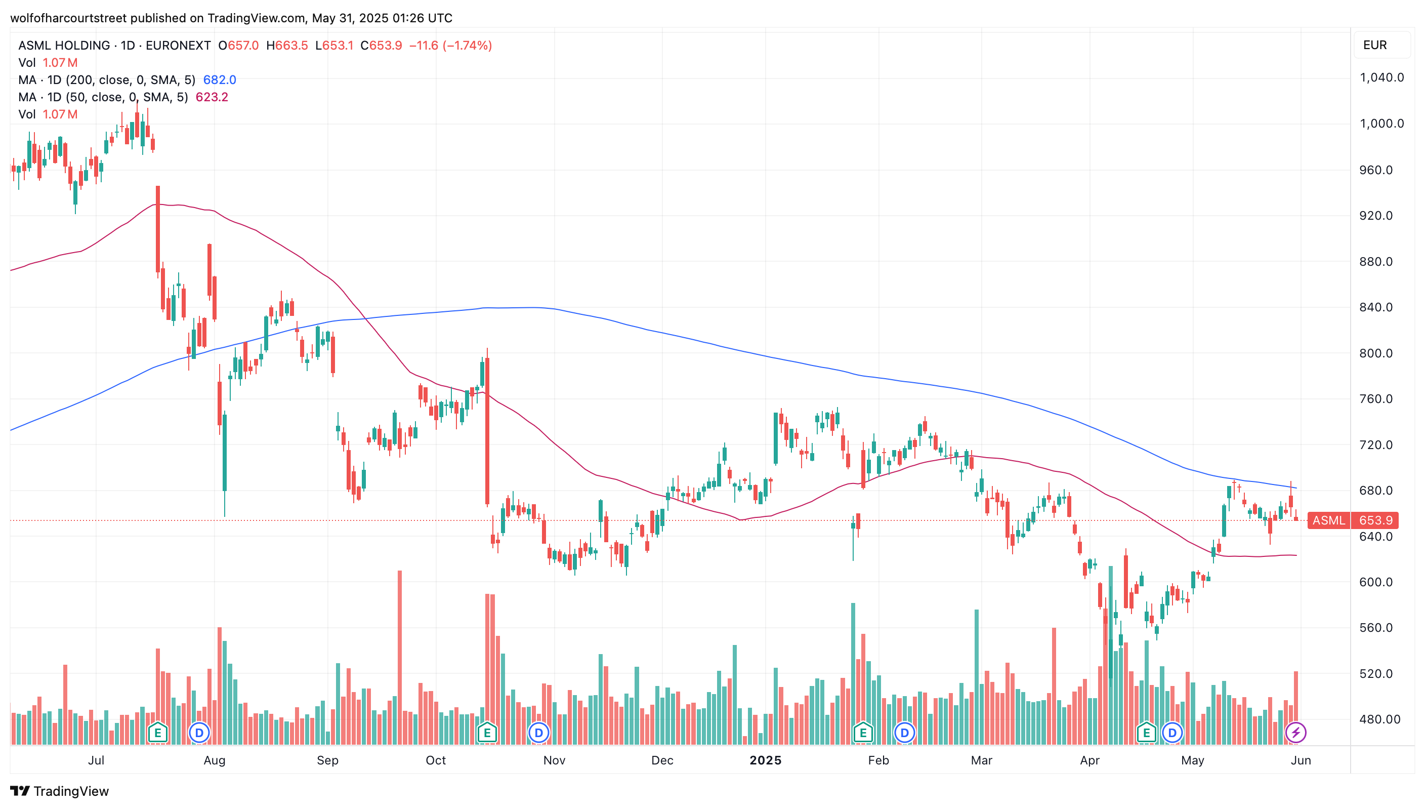 I began building a position in ASML earlier this year and continued adding this month. I find the stock attractive below €700, and it has mostly traded between €600 and €700 over the past six months.